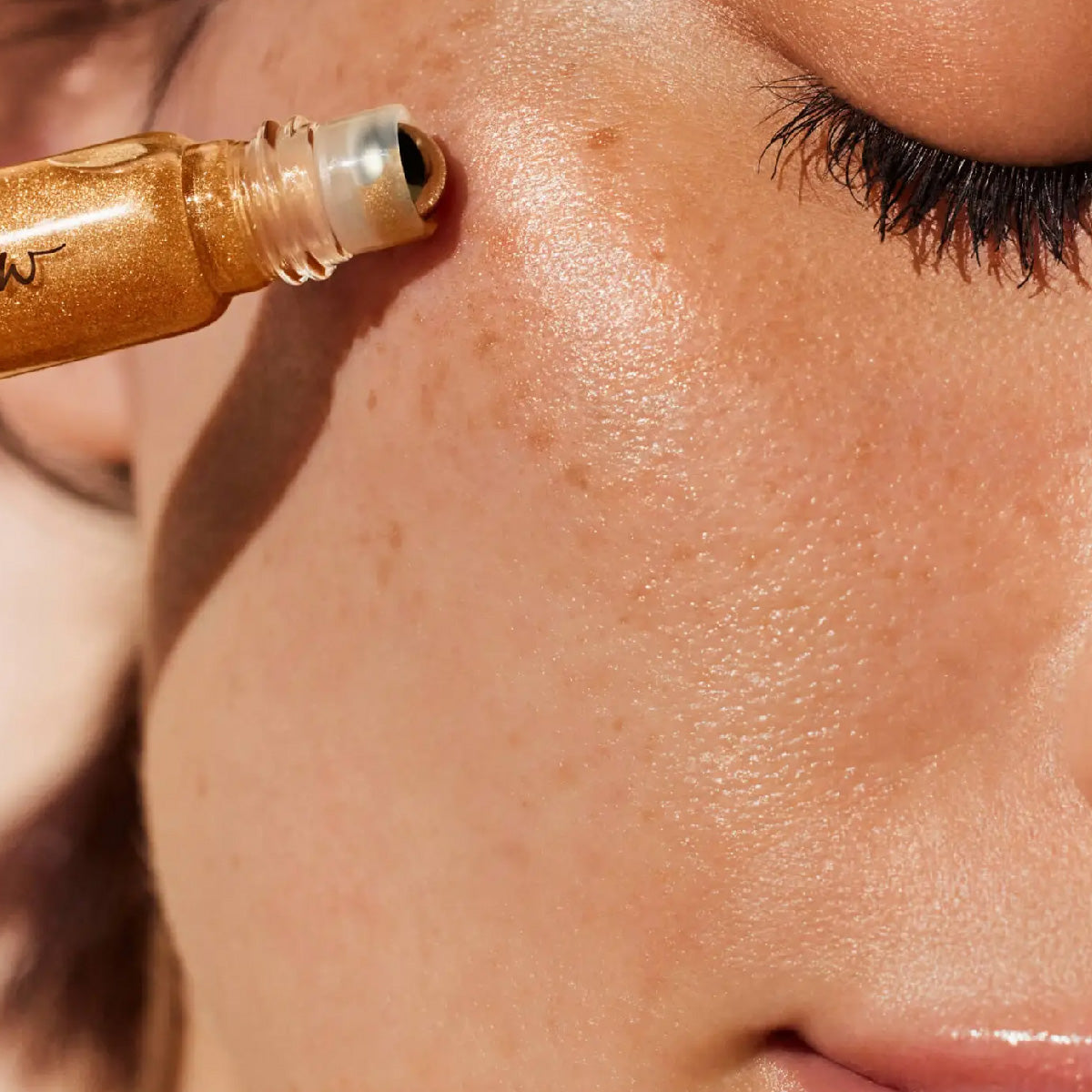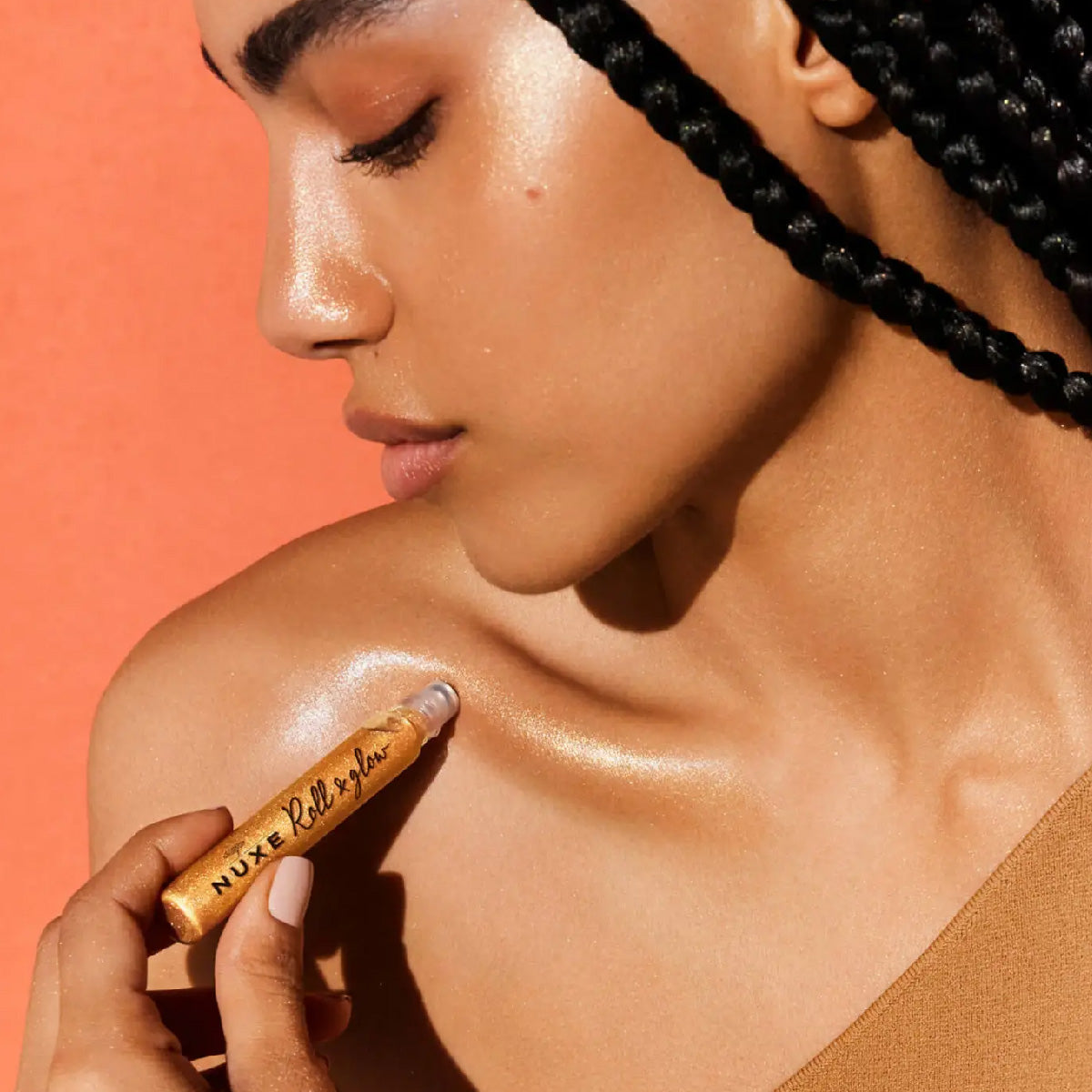 Dab lightly over the skin, focusing on highlight areas (cheekbones, bridge of the nose, forehead above the eyebrows, decolletage, shoulders) then blend with your fingertip. To give your skin a beautiful golden glow.