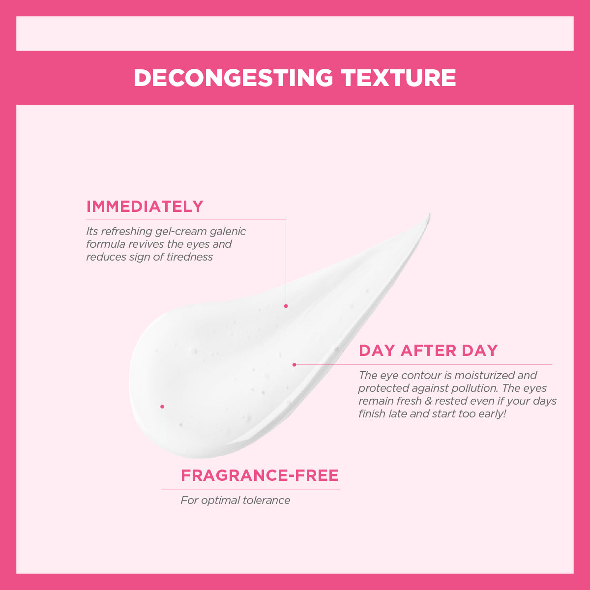Enriched with Bio-active Water [Betaine, Inositol, Taurine] and caffeine, our eye contour care moisturizes 24 hours* and acts on all concerns of the eye contour: dark circles, bags and fine lines from dehydration with anti-pollution protection. The texture of our eye contour care is that of a non-sticky gel cream. HYDRA+ Radiance Eye Contour leaves the skin soft and supple. Non-comedogenic. Tested under dermatological and ophthalmological control.