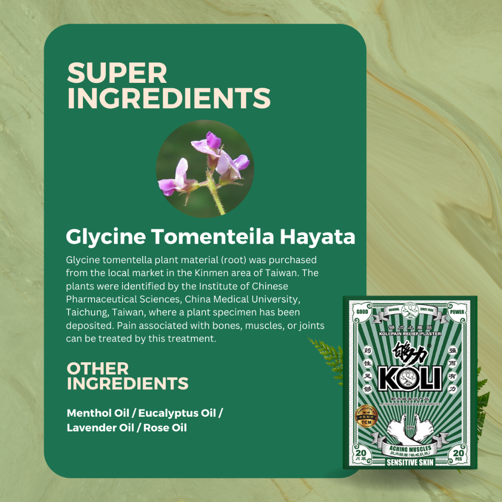- Formulated for sensitive skin individuals. KOLI has developed a pain plaster that is gentle to the skin.