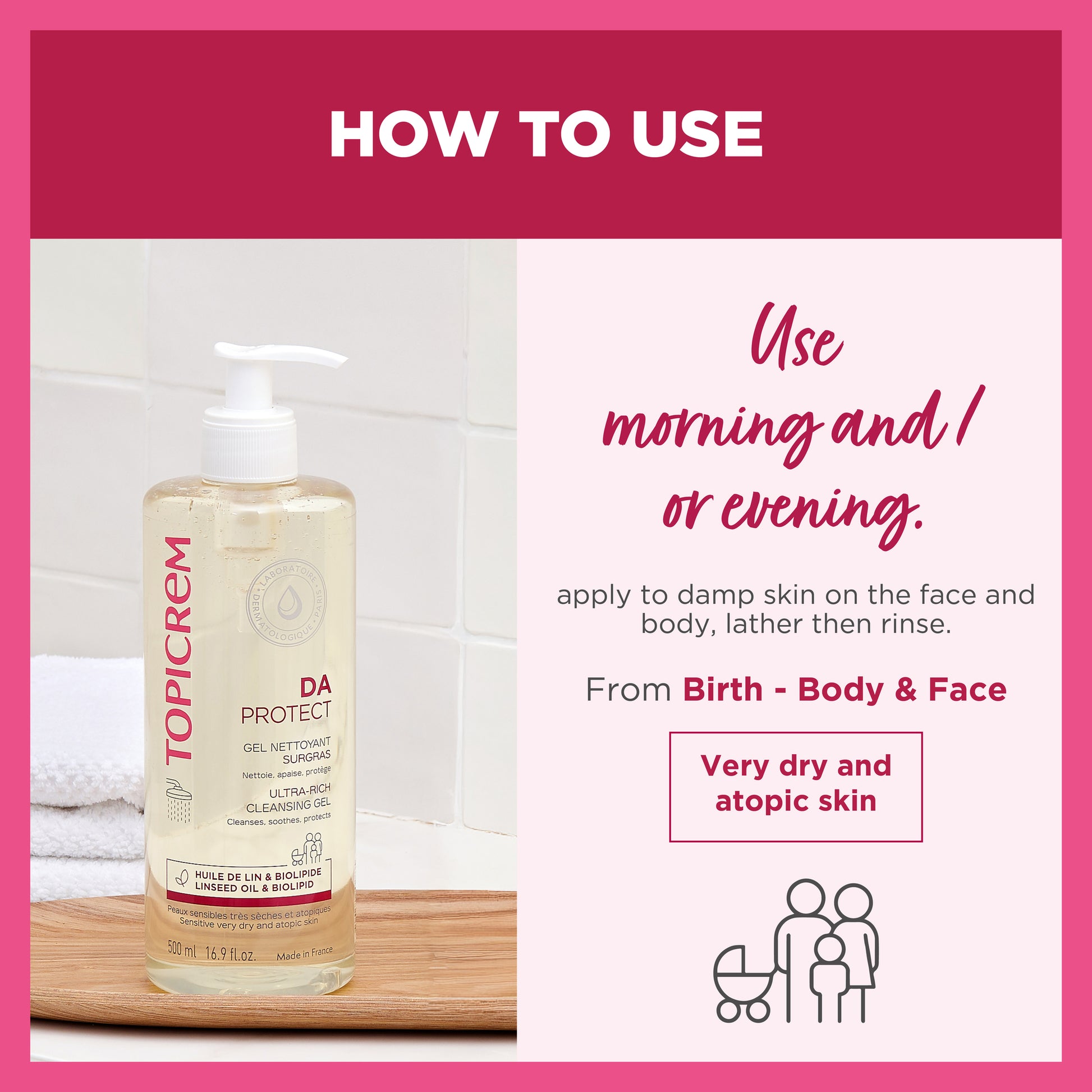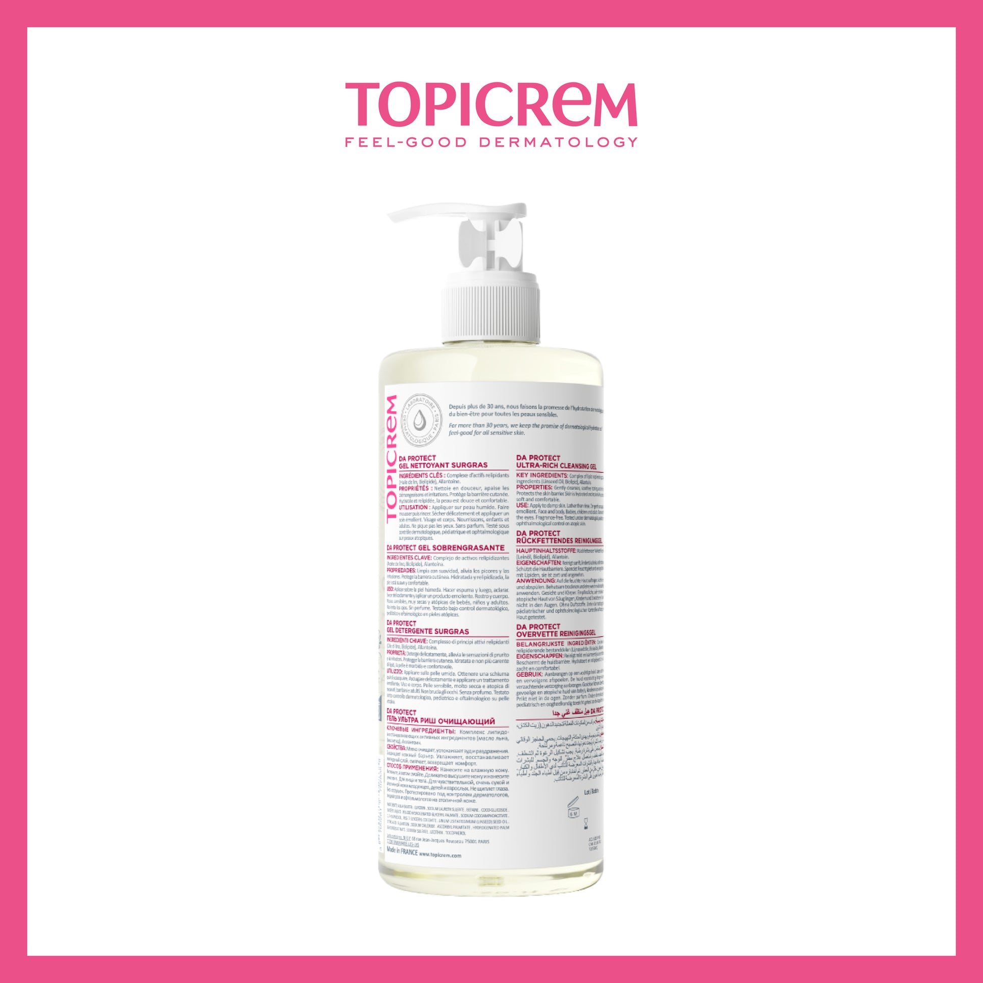 Enriched with lipid-replenishing ingredients, DA PROTECT Surgras Cleansing Gel gently cleanses and soothes sensitive, very dry and atopic skin for the whole family. This superfatted cleansing gel for atopic skin soothes itching and irritation . It moisturizes the skin and protects the skin barrier from the shower. Its superfatted texture with delicate foam leaves the skin soft and comfortable. Does not sting the eyes. Tested under dermatological, ophthalmological and pediatric control.