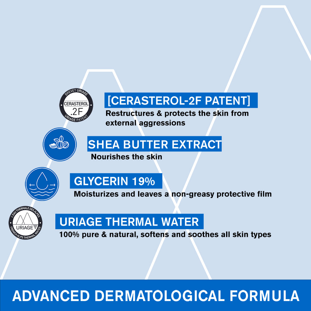 - Rich washing base, with cerasterol-2F® and Uriage thermal water for a soothing, restructuring, nourishing and balancing cleansing action