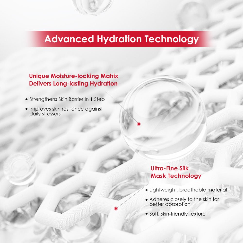 surface moisture locking. The advanced Silk Mesh Mask Sheet carries 10x more essence for better adhesion and enhanced absorption, offering a comfortable fit without residue. Free of mineral oils, preservatives, heavy metals, fragrance, and alcohol, it's safe even for highly reactive skin.